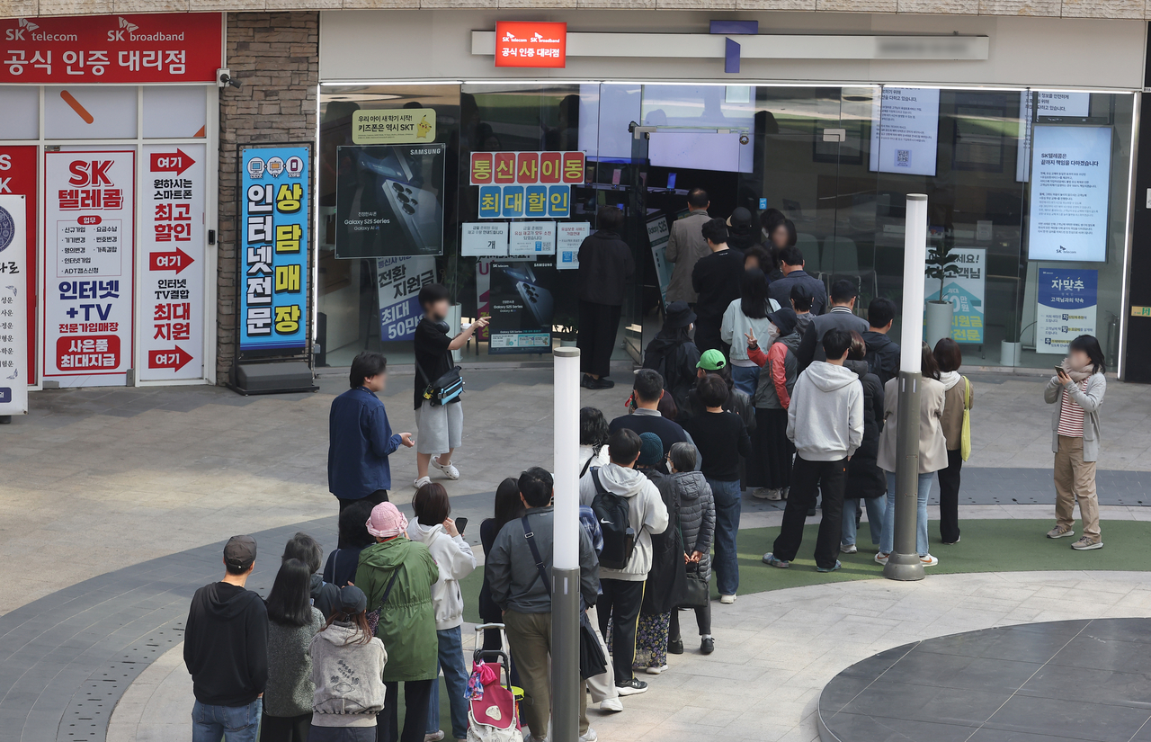 | SK텔레콤 해킹 사태로 고객 이탈이 가속화되면서, 고객 유치를 위한 통신 3사 간의 과열 경쟁이 극심해지고 있다. 서울 시내 한 SKT 대리점 앞에서 유심을 교체하려고 시민들이 줄을 서 기다리고 있다. [연합] |
