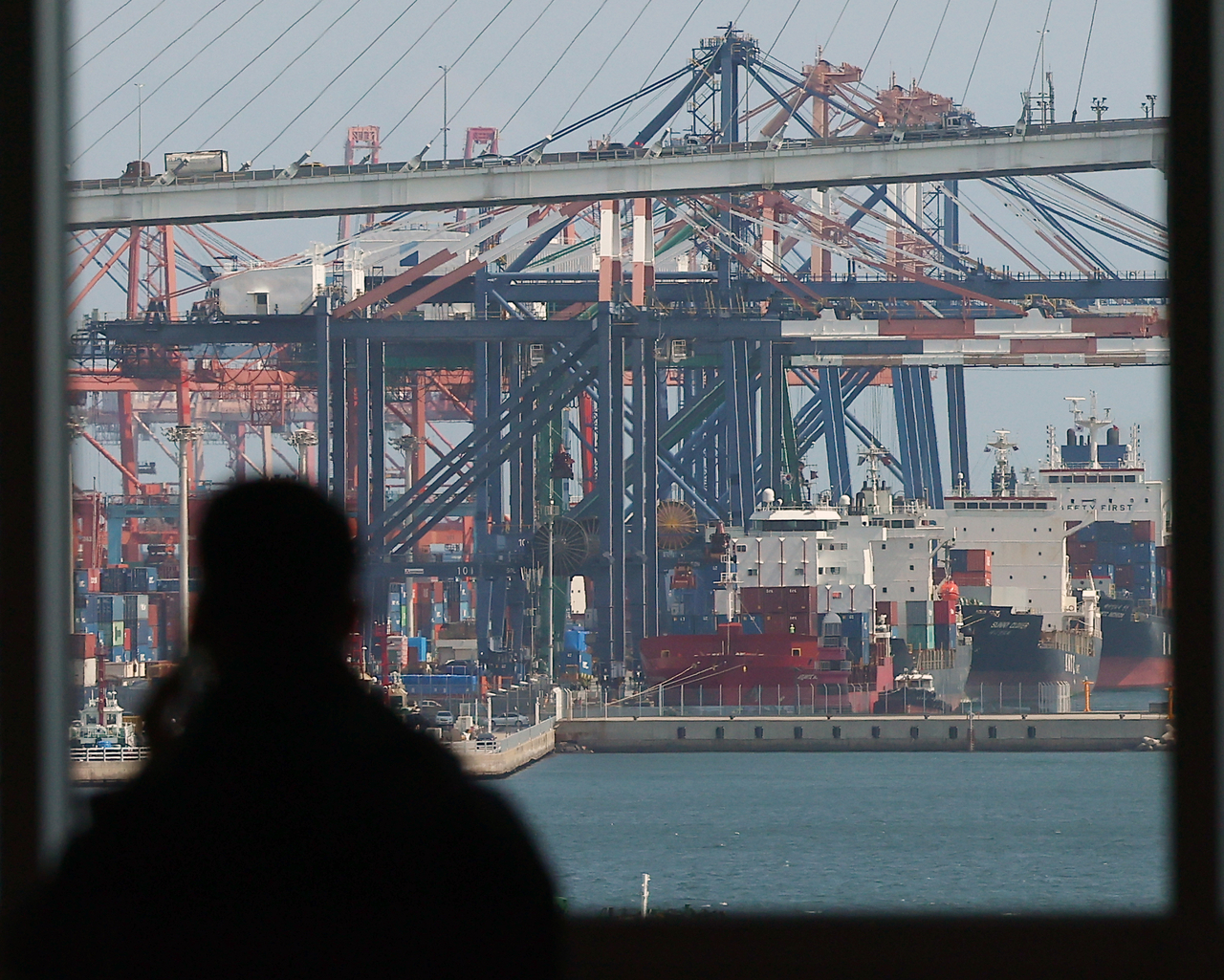 | 부산 동구 부산항국제여객터미널 유리창으로 부산항 북항이 보이고 있다. [연합] |