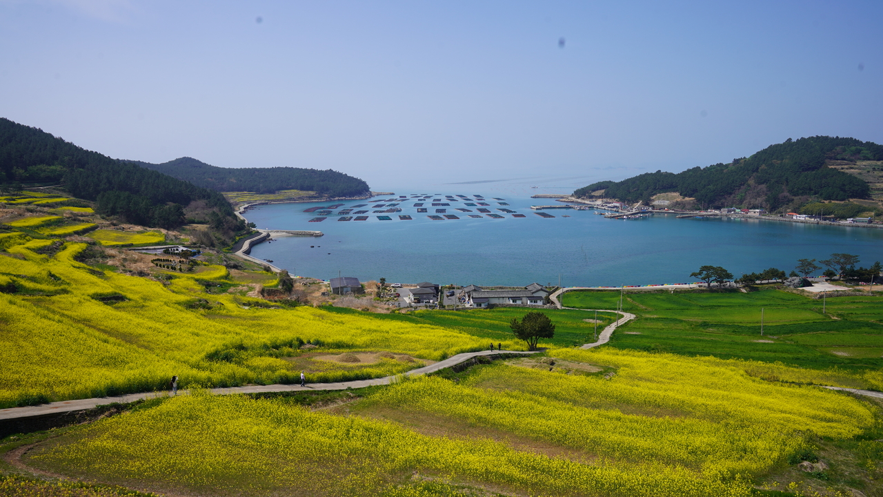 전라남도 완도군에 있는 섬 청산도는 특히 봄이 아름답다. 바람과 햇살을 가득 담은 노란 유채꽃과 푸른 바다를 닮은 청보리 물결이 일렁이며, 마치 한 폭의 수채화처럼 펼쳐지면서 섬 특유의 자연경관과 어우러져 그 자체로 아름다운 풍경을 자랑한다.