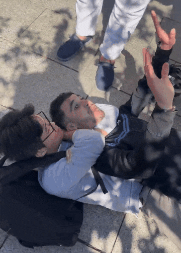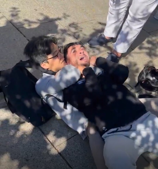 영상에는 중국인 사진작가가 소매치기를 바닥에 눕히고 ‘목 조르기’ 기술을 쓰고 있는 장면이 담겼다. 목 조르기는 치명적인 급소인 목을 압박해 목으로 가는 공기 흐름을 제한하는 공격 방법이다. 이는 뇌로 가는 혈류를 차단해 일시적인 의식 불명에 이르게 할 수 있다.