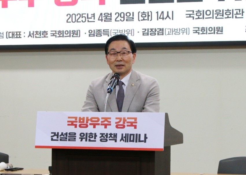 | 29일 ‘국방우주 강국 건설을 위한 정책 세미나’를 공동 주최한 국민의힘 서천호 국회의원이 인사말을 하고 있다. [서천호 의원실 제공] |