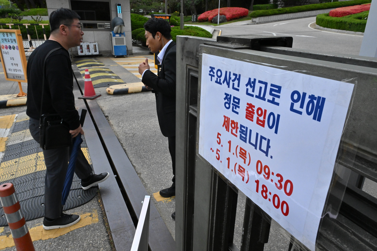| 이재명 더불어민주당 대선 후보의 상고심 선고를 앞둔 대법원 정문에서 보안 관계자가 출입을 통제하고 있다. 임세준 기자 |