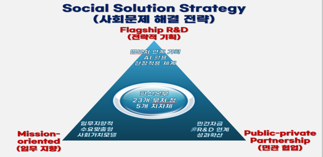 특히 올해는 사회문제해결 3대 전략의 중점 추진 사항으로 ▷사회적 가치(Social Value : 사회적·경제적 파급효과) 시범 적용 및 현장 적용성을 높이는 범부처 플래그십 사업 기획 ▷부처 고유 임무 중심의 문제해결력을 강화하는 수요 맞춤형 R&D 사업 추진 ▷민간투자와 연계한 정부R&D 성과 활용확산을 촉진하는 민관 협업 체계 강화를 제시했다.