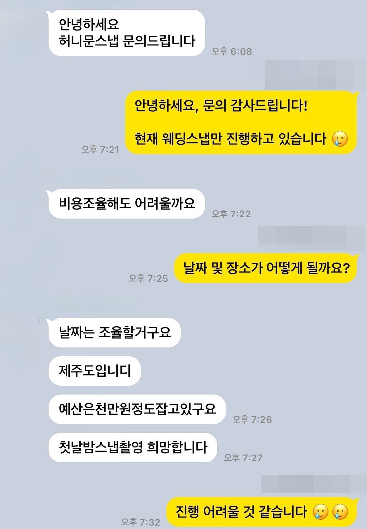 또 사진작가 D씨도 카카오톡으로 받은 메시지를 공개하며 허니문 스냅 촬영 문의를 거절했다고 전했다.