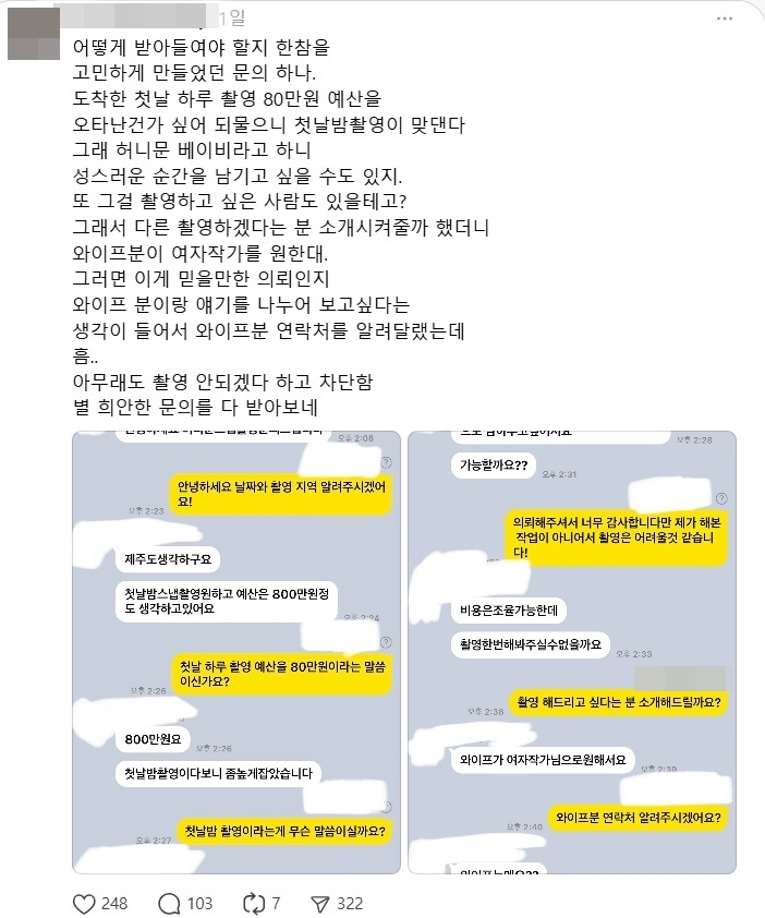평균 스냅 촬영 비용에 비해 지나치게 높은 예산에 A씨가 “80만원이라는 말씀이냐”고 재차 묻자 남성은 “800만원”이라며 “첫날밤 촬영이다 보니 조금 높게 잡았다”고 답했다.