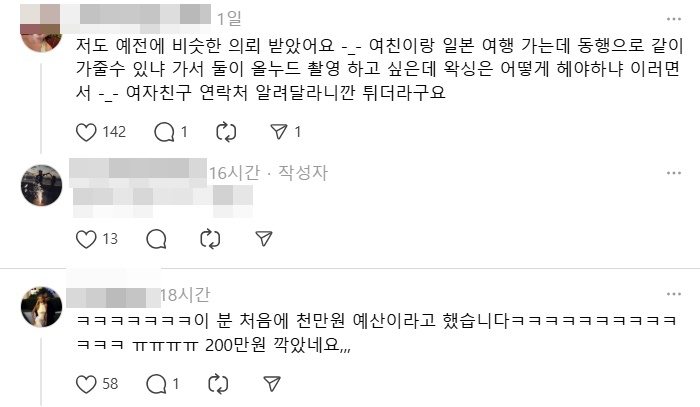 사진작가 B씨는 “저도 예전에 비슷한 의뢰를 받았다”며 “여자친구와 일본 여행을 가는데 동행으로 같이 가줄 수 있느냐. 둘이 올 누드로 촬영하고 싶은데 왁싱은 어떻게 해야하냐 문의했다”고 말했다. 그러면서 “여자친구 연락처를 알려달라고 하니 튀었다”고 설명했다.