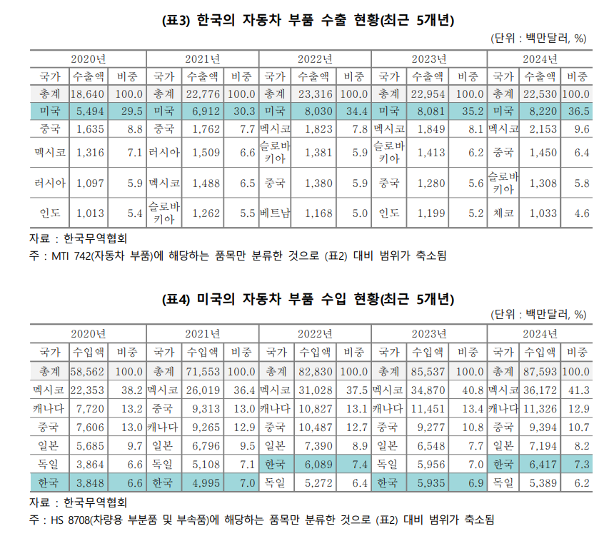 한편 무협은 최근 통계를 통해 “현재 미국은 우리나라의 자동차 부품 최대 수출 시장이며, 미국 기준 한국은5~6위 수입국에 해당한다”고 설명했다. 무협에 따르면 한국의 자동차 부품 대미 수출 비중은 2020년 29.5%에서 2024년 36.5%로 증가했다. 또한 미국의 대한국 수입 비중도 2020년 6.6%에서 2024년 7.3%로 소폭 증가했다.