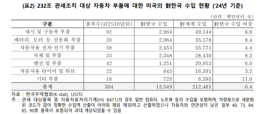 특히 ▷차체 및 부품(33개 품목 23억4800만 달러, 8.3%) ▷배터리·모터 등 전동화 부품(39개 품목 29억6400만 달러, 8.4%) 등 품목은 우리 기업들의 수출 비중이 8.0%를 넘겼다. 제품 분류 방식 중 HTS10 단위로 이번 관세에 영향을 받을 품목을 계산했을 때는 총 304개로, 새시 및 구동축 부품이 92개로 가장 규모가 컸다.