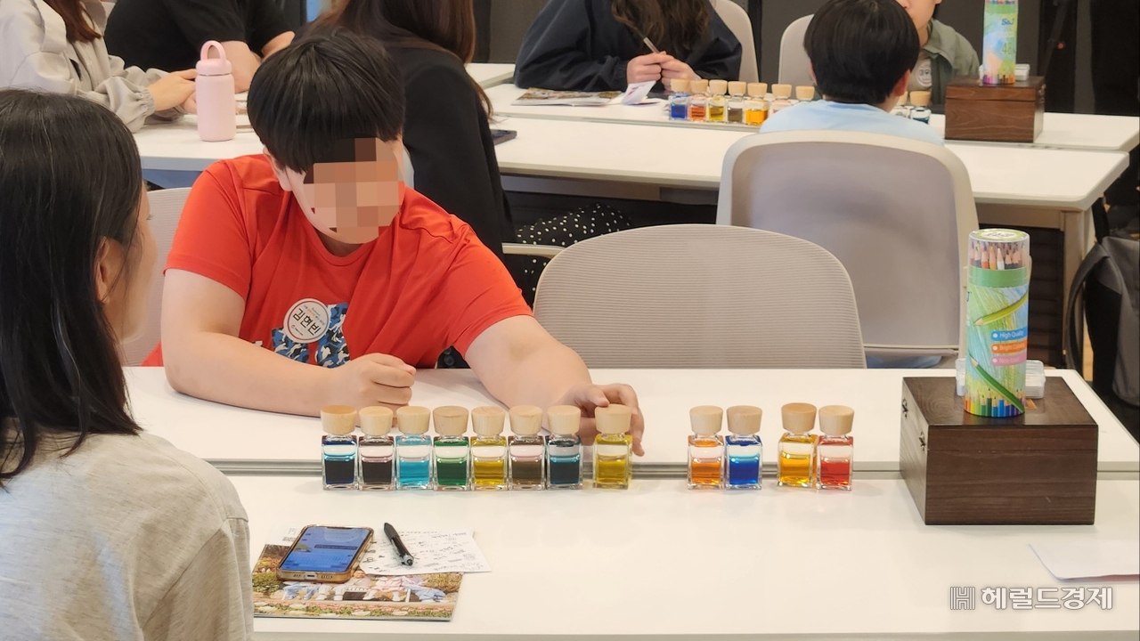 부모와 자녀가 함께하는 ‘칼라 인 힐링(Color in Healing)’ 활동도 이뤄졌다. 책상마다 주황, 노랑, 파랑, 초록 등 형형색색의 물감통이 놓여있었고 강사는 이를 가리키며 ‘지금 기분을 색으로 표현해보자’라고 제안했다.