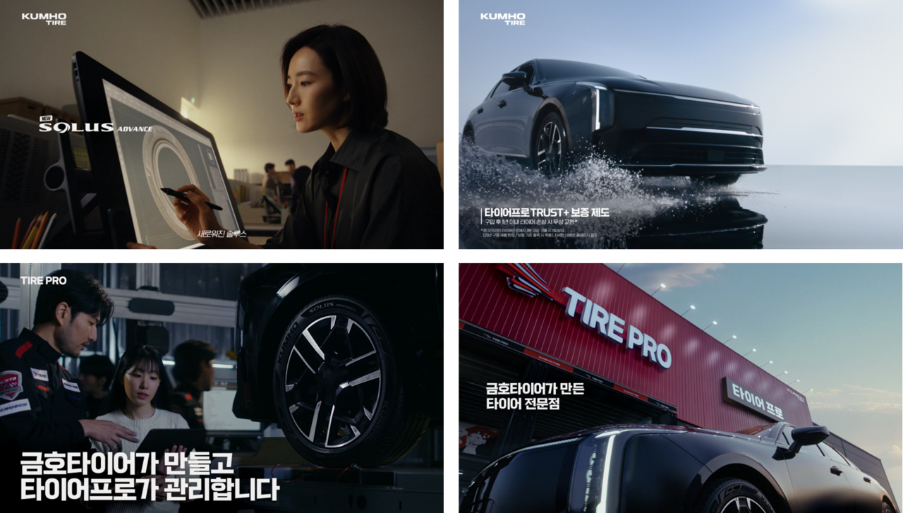 이번 광고는 올해 새롭게 선보이는 신제품 3종을 통한 제품 기술력과 금호타이어가 만든 타이어프로의 전문성을 강조하는 구성의 광고영상으로 자사 디자이너, 연구원, 성능평가 테스터 등과 타이어프로 직원(정비사)의 시너지를 통해 고객에게 항상 최상의 서비스를 제공한다는 내용을 담았다.