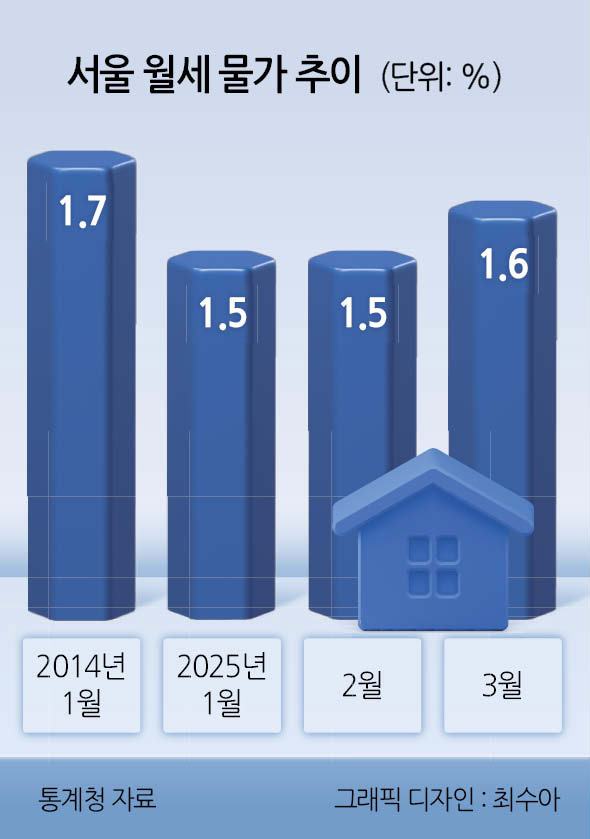 2일 한국은행 경제통계시스템(ECOS) 등에 따르면 3월 서울특별시 월세 소비자물가는 지난해 같은 달과 비교해 1.6% 올랐다. 2014년 1월(1.7%) 이후 11년 2개월만에 가장 큰 폭 상승이다.