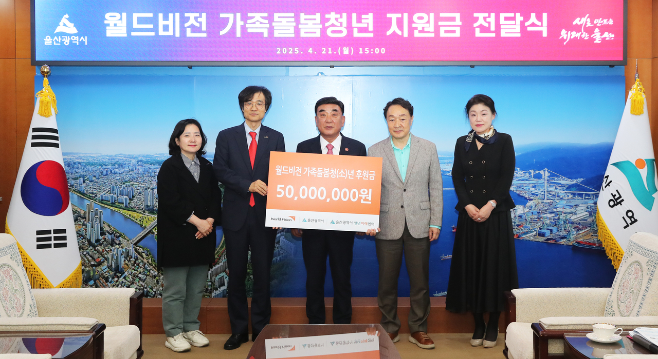 | 울산시가 청년과 어르신의 재능을 활용한 돌봄사업을 추진한다. 사진은 김두겸 시장이 지난달 21일 ‘울산 월드비전 가족돌봄’ 참여 청년에게 지원금을 전달하고 있는 모습. [울산시 제공] |