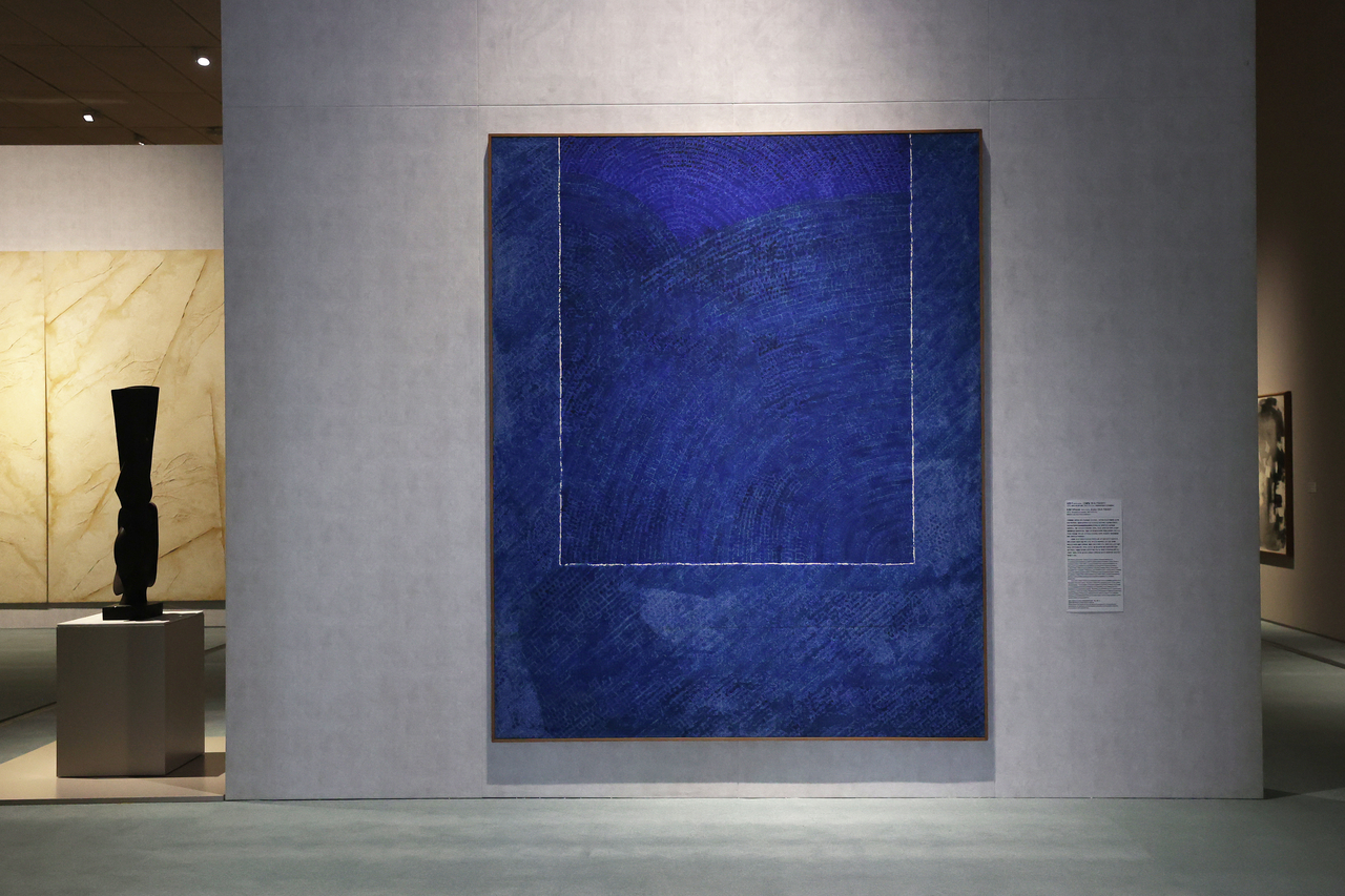 | 국립현대미술관 서울관에서 진행되는 소장품 상설전 ‘한국현대미술 하이라이트’ 전시 전경. 전시장 도입부에 김환기 ‘산울림 10-Ⅴ-73 #314’(1973)이 전시돼 있다. 이 전시는 이건희 컬렉션 9점을 포함한 한국 현대미술 대표작 86점을 소개한다. [연합] |