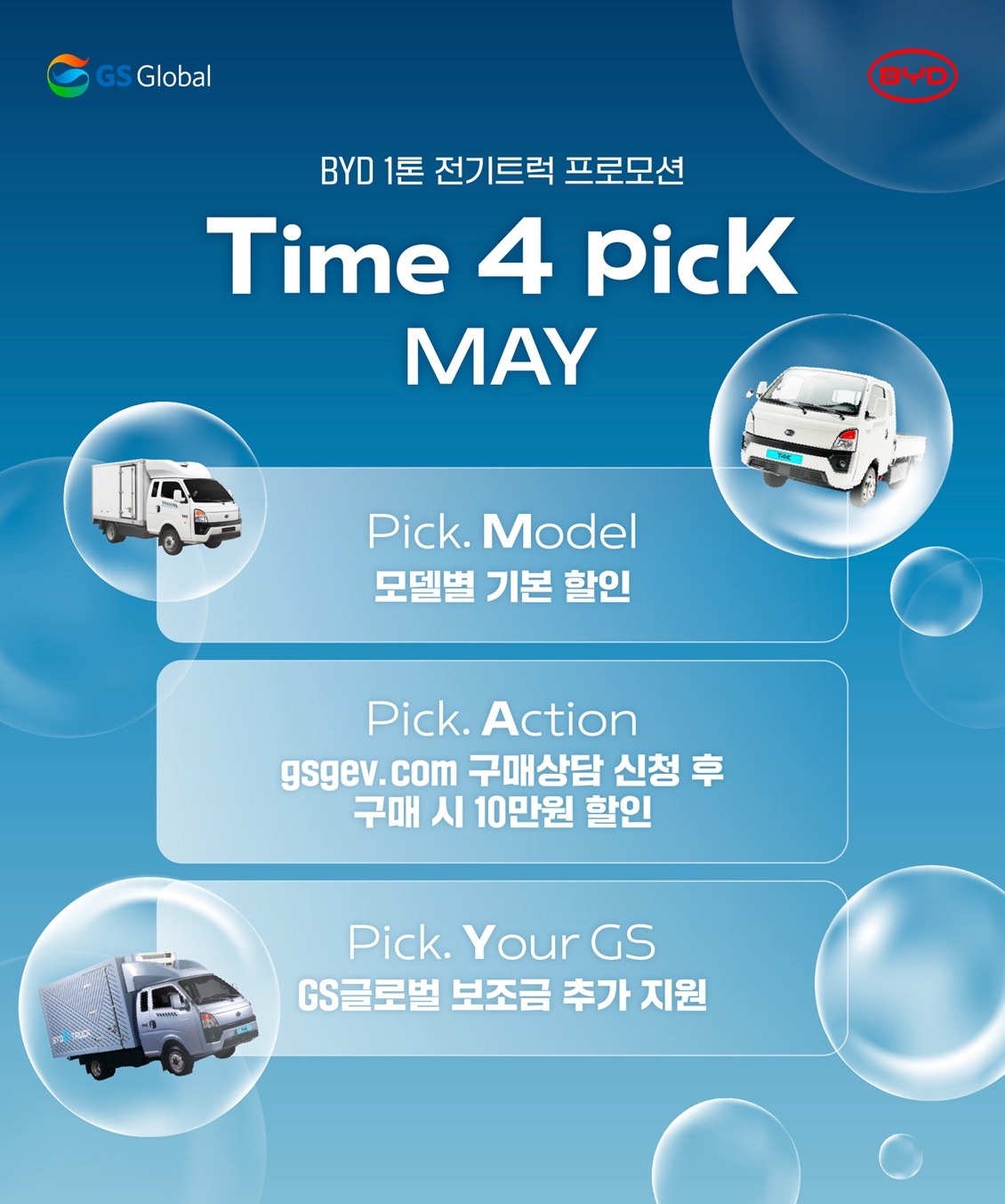 [헤럴드경제=서재근 기자] GS글로벌이 5월 한 달간 BYD 1톤 전기트럭 T4K 구매 고객을 대상으로 파격적인 구매 혜택을 제공하는 특별 프로모션을 진행한다고 2일 밝혔다. 특히, 이번 프로모션을 통해 2024년형은 물론 2025년형 T4K도 보다 합리적인 가격에 만나볼 수 있다