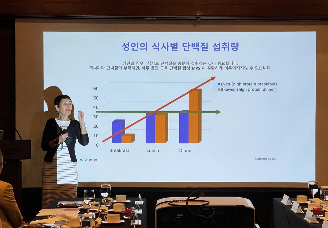 연사로 나선 레슬리 본시도 “대부분 점심과 저녁에 단백질을 많이 먹고, 아침이나 간식에선 단백질을 잘 챙기지 않는다”고 말했다. 그는 “끼니마다 단백질을 충분히 섭취하지 않으면, 체내 단백질이 분해되기 쉽다”고 했다. 동일한 양을 먹더라도 균형 있게 분배해서 먹어야 단백질 합성에 효과적이란 설명이다.