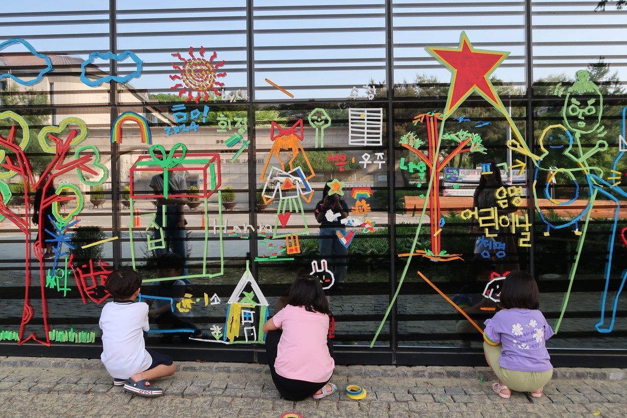 | 백남준아트센터 외벽을 마스킹 테이프로 꾸미는 어린이들 모습. [경기문화재단] |