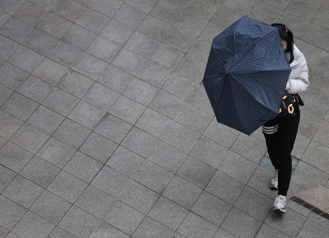 | 서울 중구 동대문디자인플라자(DDP)에서 한 시민이 우산을 쓰고 있다. [연합] |