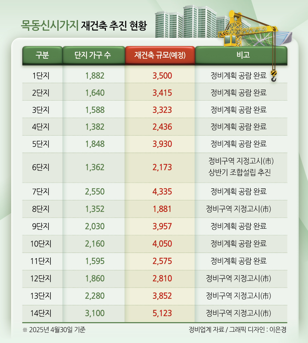 재건축 후 약 5만가구의 ‘미니 신도시’급으로 탈바꿈 예정인 목동신시가지 1~14단지 아파트는 1985년부터 1988년 사이 지어진 총 392개 동, 2만6629가구로 이뤄져 있다. 행정구역상 목동에 속하는 1~7단지는 ‘앞단지’, 신정동에 속하는 8~14단지는 ‘뒷단지’로 불린다. 이 중 구청과 오랜 갈등을 겪던 1~3단지가 지난해 11월 개방형 공공녹지(그린웨이)를 제공하는 조건으로 ‘종 상향(2→3종)’ 문제를 해결하면서 목동 일대 재건축이 급물살을 타게 됐다.