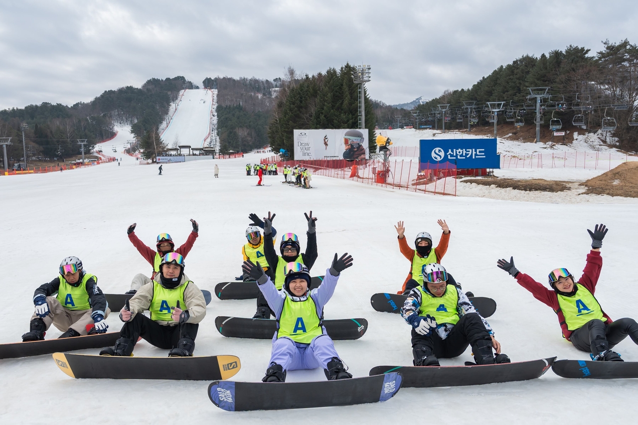 | 눈이 좀처럼 내리지 않는 대만의 방한객들이 한국에서 스노보드를 즐기고 있다. |