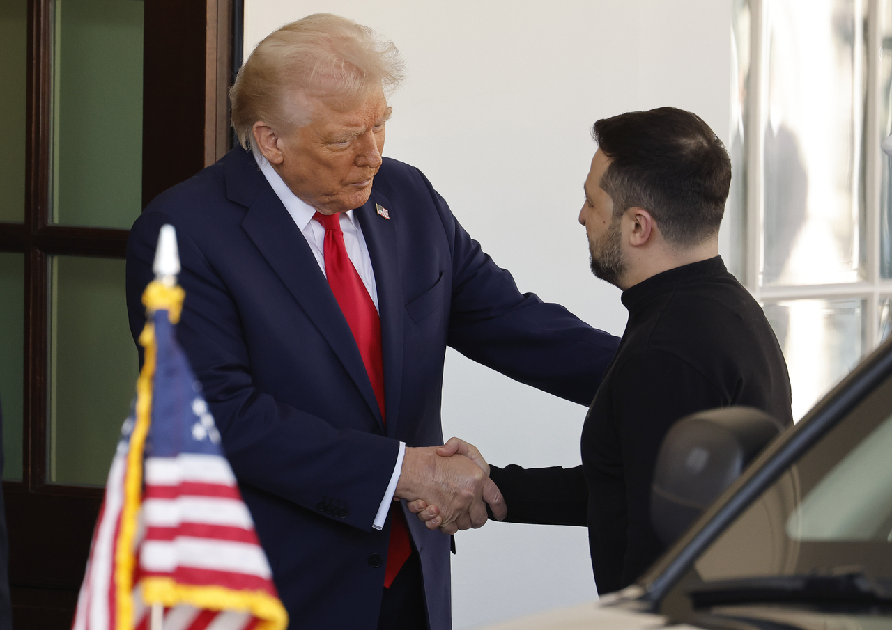 | 지난 2월 28일(현지시간) 미국 백악관 앞에서 도널드 트럼프 대통령이 볼로디미르 젤렌스키 우크라이나 대통령을 맞이하며 악수를 하고 있다. [게티이미지] |