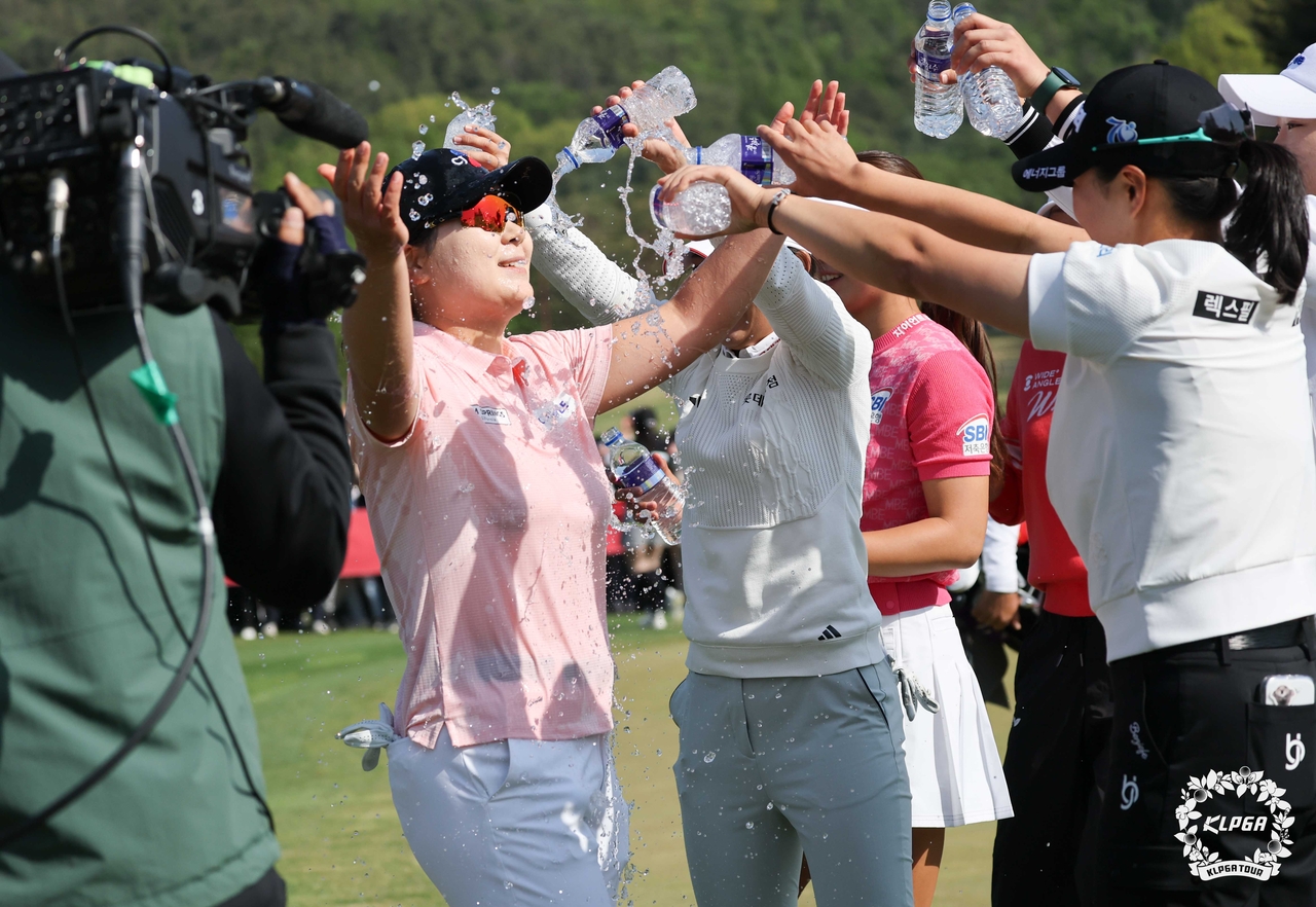 | 홍정민이 시즌 첫 메이저대회인 KLPGA 챔피언십에서 우승한 뒤 동료들의 축하 물세례를 기분좋게 받고 있다. [KLPGA 제공] |
