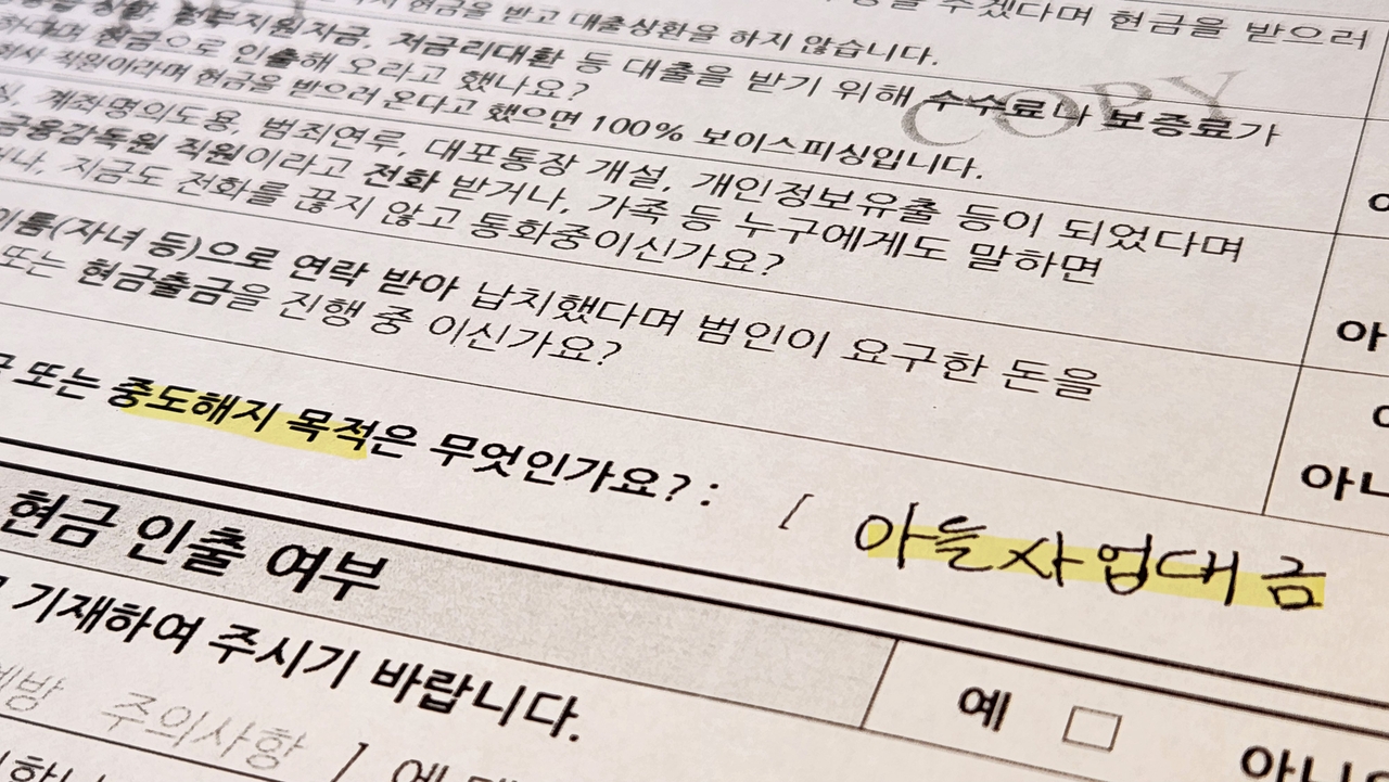 문제는 다음 날인 4일 발생했다. 서울 서부의 수협·농협 지점은 물론 인천 소재 지점으로부터 “어제 발행된 수표를 현금화하러 온 고객이 있는데 정상 거래가 맞느냐”는 문의 전화가 잇따랐다. 더 큰 문제는, 수표를 들고 온 사람이 이씨가 아니라 2001년생과 2005년생 김모씨였다는 점이다. 이들은 보이스피싱 조직의 현금 인출책이었다. 최 대리는 “전날 ‘이씨 아들의 사업자금’이라던 수표를 하루 만에 생면부지의 20대 초반의 청년들이 들고 나타난 점이 수상했다”고 말했다.