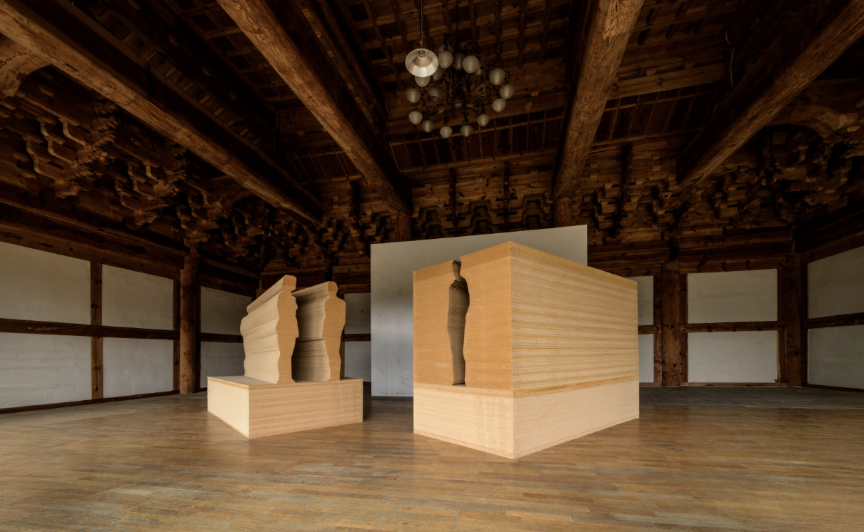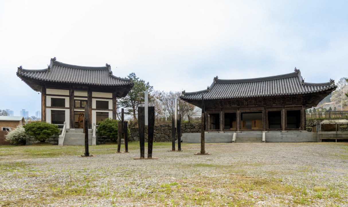 | 옛 백련사 대웅전에 설치된 이용덕의 ‘마주하기-만남’. [모란미술관] |