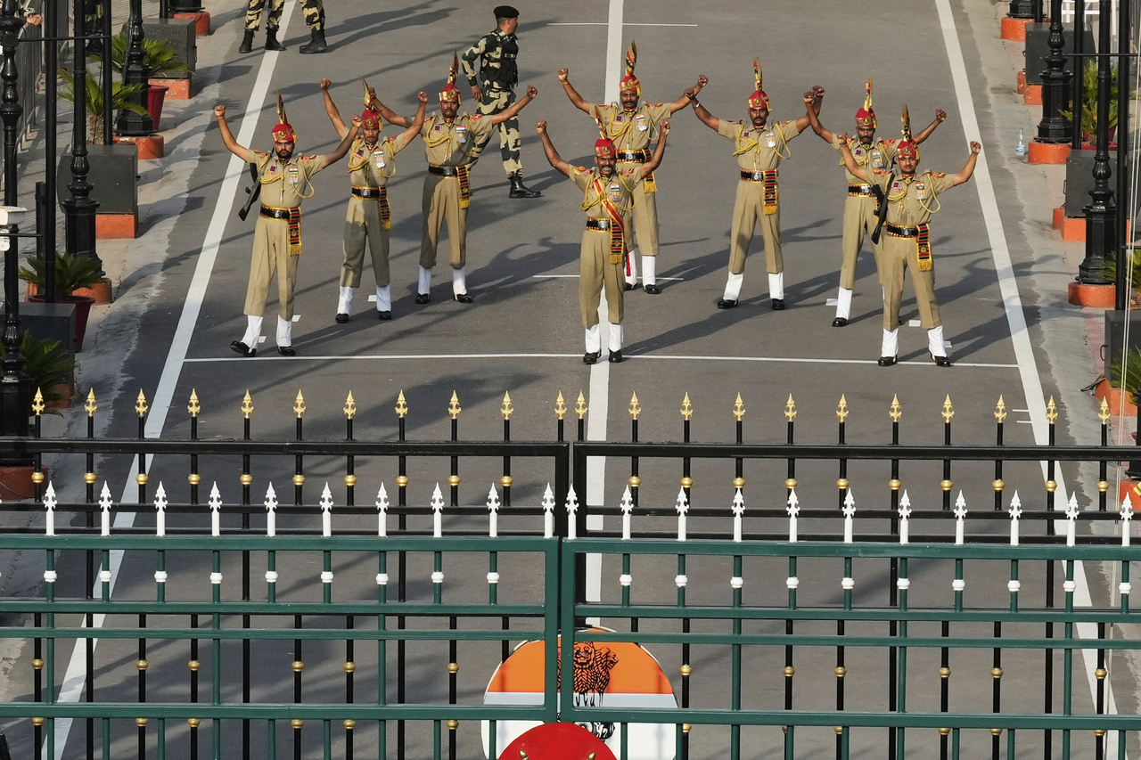 | 인도 국경수비대가 지난 5일(현지시간) 파키스탄 접경 지역인 라호르에서 매일 실시하는 출입국관리사무소 폐장식을 하고 있다. [AP] |