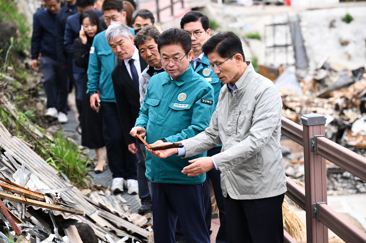| 이철우 경북지사는 6일 영덕군 석리 따개비마을 찾은 김문수 국민의힘 대선 후보에게 산불 피해 현장 등을 설명하고 있다.[경북도 제공] |