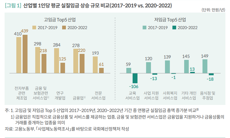 특히 고임금 산업과 대규모 사업체를 중심으로 명목임금이 크게 상승했다. 2020~2022년 사이 금융업, 연구개발업, 전문서비스업 등 고임금 산업의 실질임금은 증가했지만, 음식·주점업 등 저임금 산업은 오히려 감소했다. 이로 인해 산업 간 임금격차가 확대되며 중상위 근로자 세부담도 함께 늘었다.