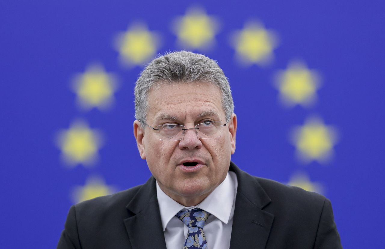 | 마로시 셰프초비치 유럽연합(EU) 무역·경제안보 담당 집행위원이 6일(현지시간) 프랑스 스트라스부르에서 열린 유럽의회 본회의에서 발언하고 있다. [EPA] |