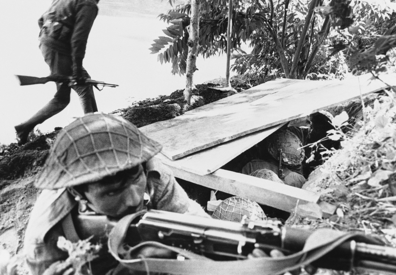 | 1971년 12월 동파키스탄 제소르 지역에서 인도군이 파키스탄 진지를 포격하는 동안 동료 병사가 소총을 겨누고 엄호 사격을 하고 있다. [AP] |