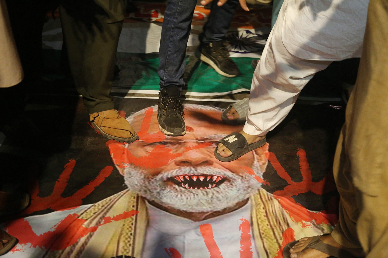 | 7일 (현지시간) 파키스탄 하이베라바드에서 열린 인도 반대 시위에서 시위대가 나렌드라 모디 인도 총리 사진이 담긴 현수막 위에 서 있다. [AFP] |
