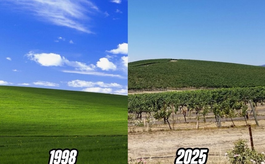 최근 한 누리꾼이 자신의 SNS 계정에 해당 장소의 변화 과정을 담은 사진을 공개하면서 다시 화제가 됐다. 배경화면 속 푸른 초원은 더 이상 없고 전부 포도밭으로 바뀌어 있었기 때문.