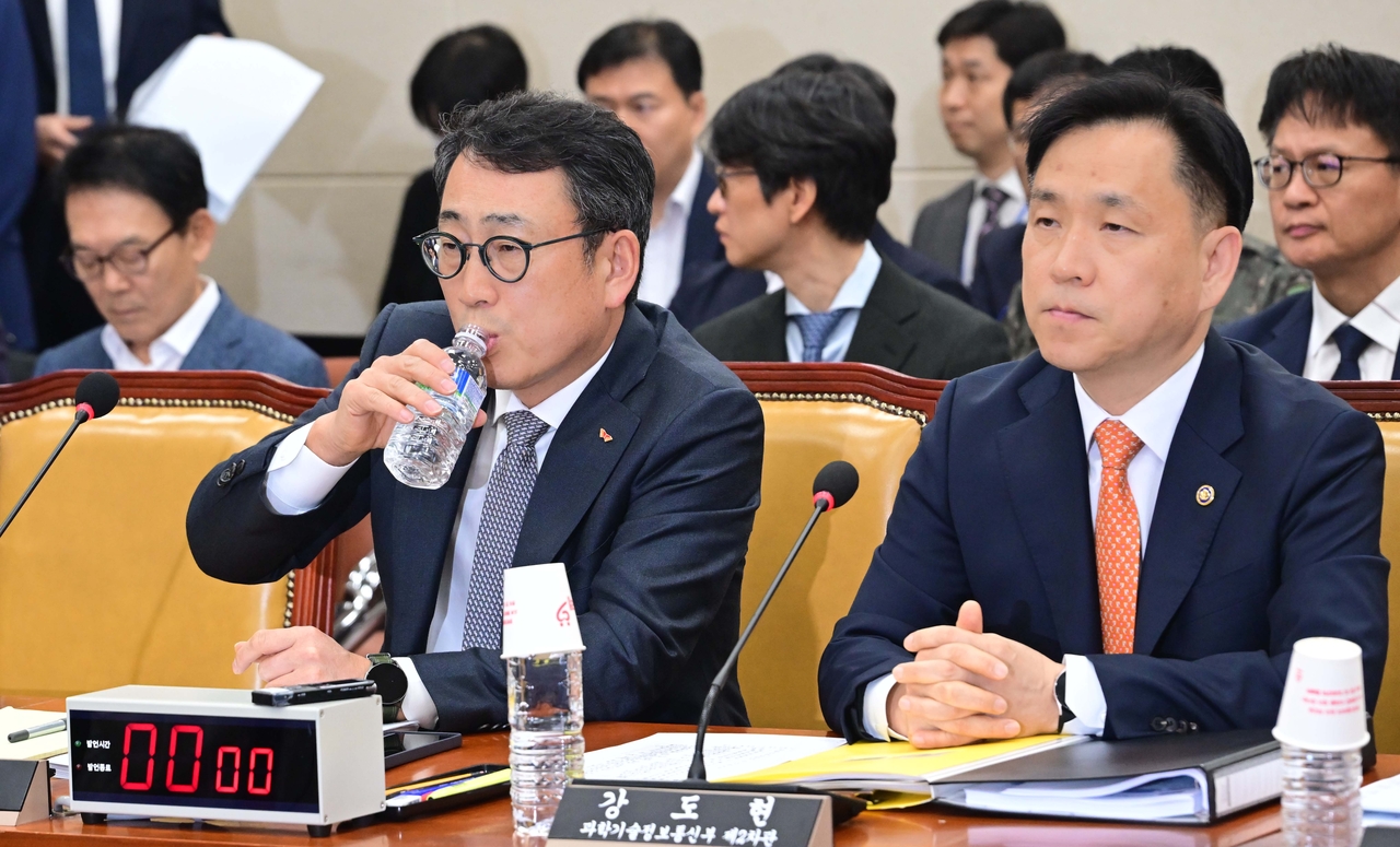 | 유영상 SK텔레콤 대표이사가 30일 국회 과학기술정보방송통신위원회의에서 열린 방송·통신 분야 청문회에 참석해 물을 마시고 있다. 이상섭 기자 |