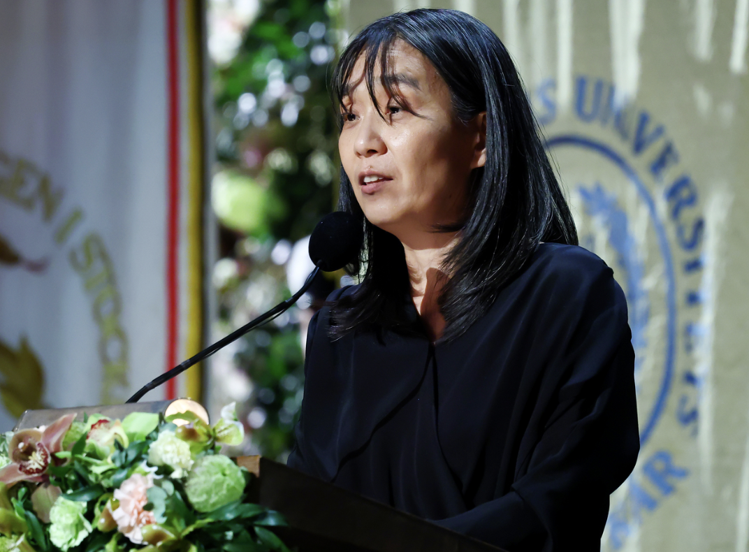 | 2024 노벨문학상 수상자인 한강 작가가 지난해 12월 스웨덴 스톡홀름 시청사에서 열린 연회에서 수상 소감을 밝히고 있다. [연합] |