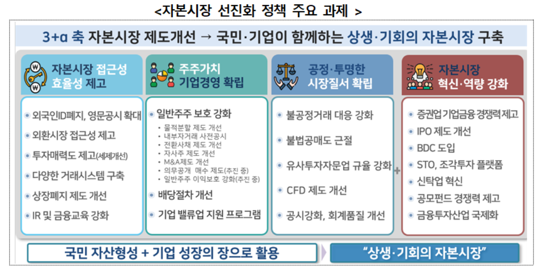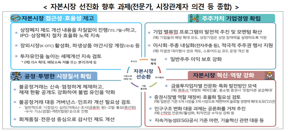 강소현 자본시장연구원 선임연구위원은 “자본시장 선진화 정책이 상장기업의 가치를 제고하고 시장의 신뢰를 회복할 만큼 가시적인 성과가 나타나고 있다”면서 “국내 자본시장의 구조적 변화에 선제적으로 대응하기 위해 상장시장의 질적 성장, 복수시장 체제 선진화 등이 필요하다”고 했다.