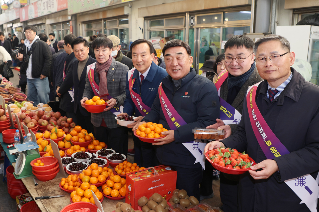 | 울산시가 가정의 달을 맞아 울산 지역 6개 전통시장에서 온누리상품권 환급행사를 연다. 김두겸 울산시장(오른쪽에서 세 번째)이 전통시장을 찾은 모습 [울산시 제공] |