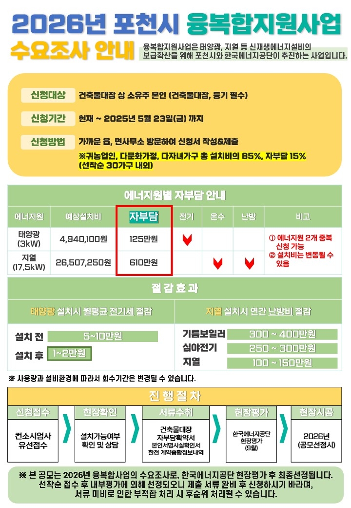 [헤럴드경제=박준환 기자]포천시(시장 백영현)가 산업통상자원부 주관 ‘2026년 신재생에너지 융복합지원사업’ 공모 신청을 위한 수요 조사를 5월 23일까지 실시한다.
