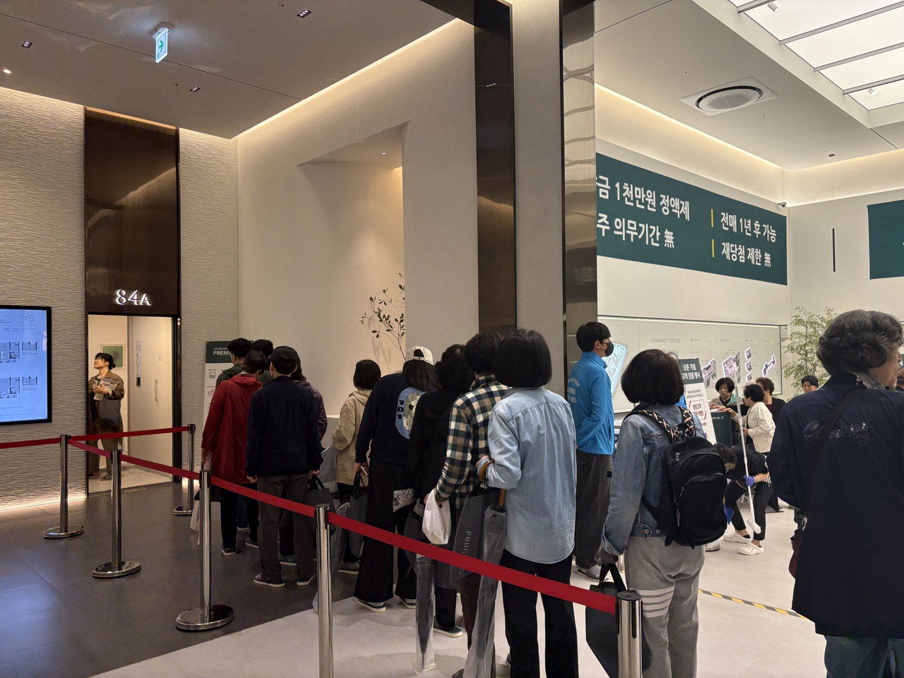 | 견본주택에 마련된 84A타입 유닛을 둘러보기 위해 줄을 선 방문객들. [정주원 기자] |