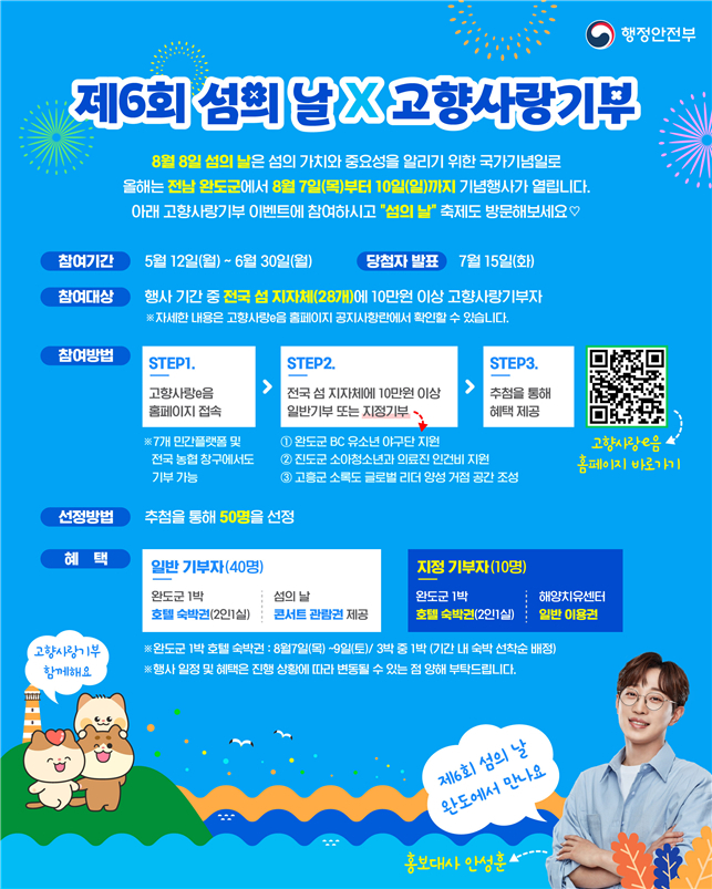 [헤럴드경제=이태형 기자]행정안전부는 오는 8월 8일 전남 완도군에서 열리는 ‘섬의 날 기념행사’를 기념해 ‘제6회 섬의 날×고향사랑기부’ 이벤트를 진행한다고 12일 밝혔다.