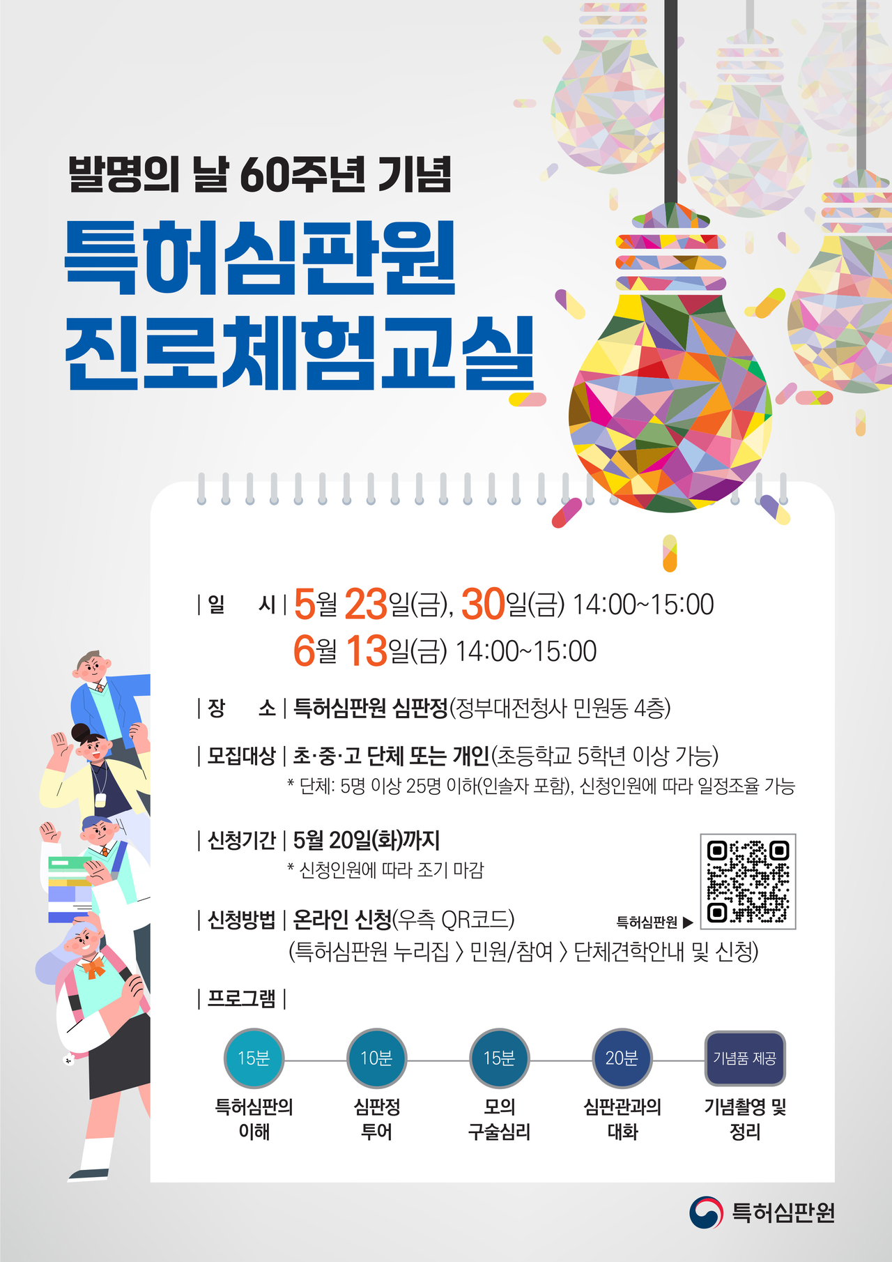 이번 체험교실은 발명의 날 60주년을 맞아 청소년들에게 특허분야 전문가로서의 진로를 탐색할 수 있는 기회를 제공하기 위해 마련했다. 정부대전청사 민원동에 위치한 특허심판원 심판정에서 열리며, 모집대상은 초·중·고등학생(초등학생은 5학년 이상)이다. 단체 또는 개인이 20일까지 특허심판원 누리집을 통해 신청할 수 있다.