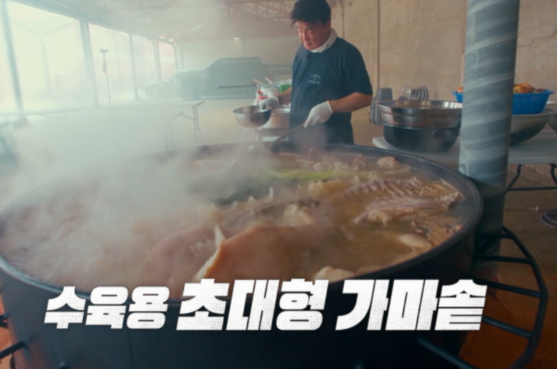 | 백종원 더본코리아 대표가 특별 제작한 초대형 가마솥으로 요리하는 모습. [유튜브 ‘백종원’] |