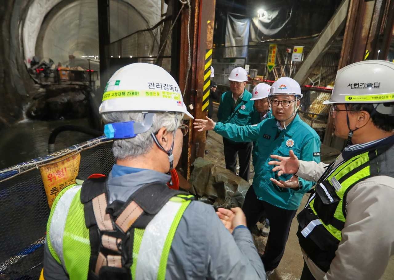 | 유성훈(사진 가운데) 금천구청장이 지난 9일 신안산선 공사 현장(독산정거장 및 시흥동 작업구)에서 안전점검을 하고 있다. [구로구 제공] |