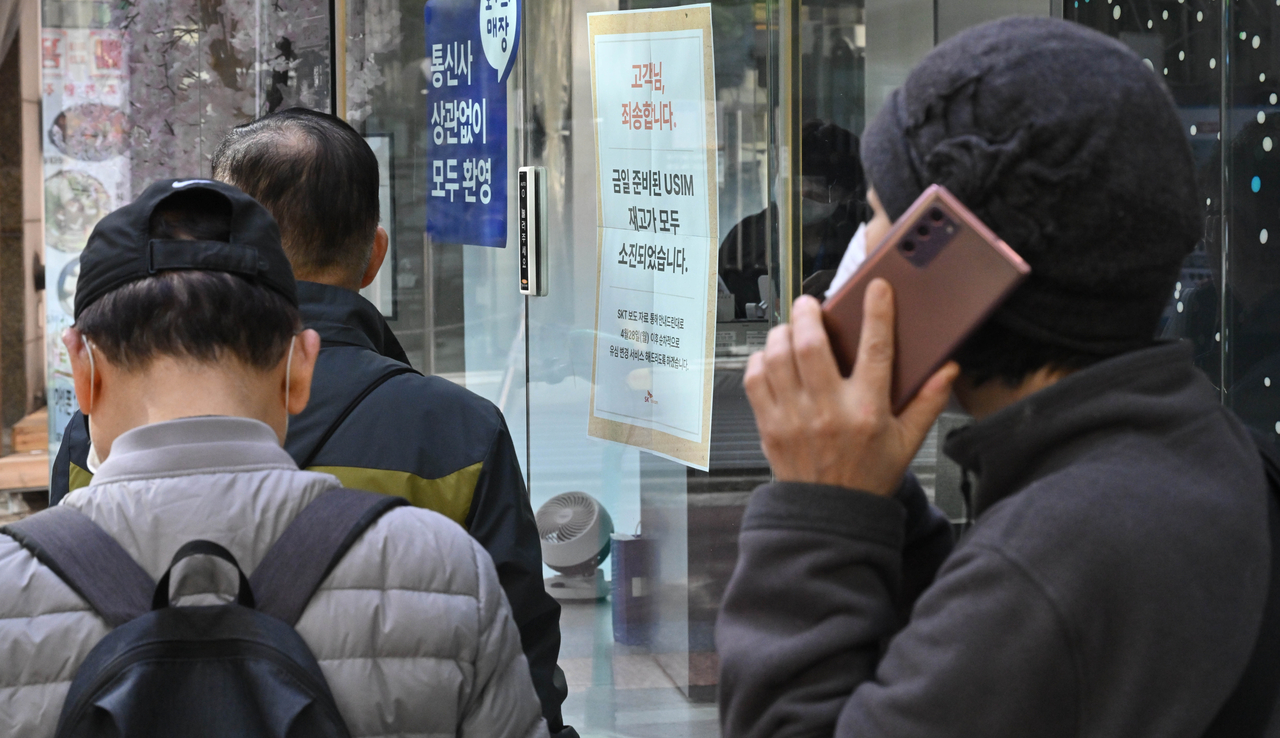 | 지난달 28일 서울 마포구 SK텔레콤 홍대역점에서 시민들이 유심칩을 교체 받기 위해 대기하고 있다. 임세준 기자 |