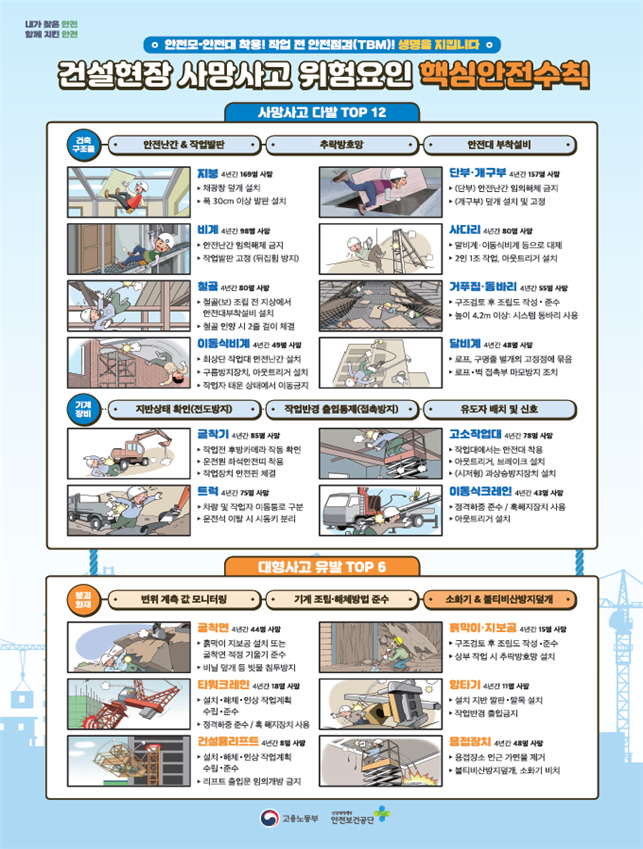 특히, 건설현장에서 가장 많이 발생하는 ‘추락’사고 예방을 위해 ▷안전난간·개구부 덮개 설치 ▷안전대 착용 등과 같은 기본적 수칙을 준수하는지를 중점적으로 확인한다.