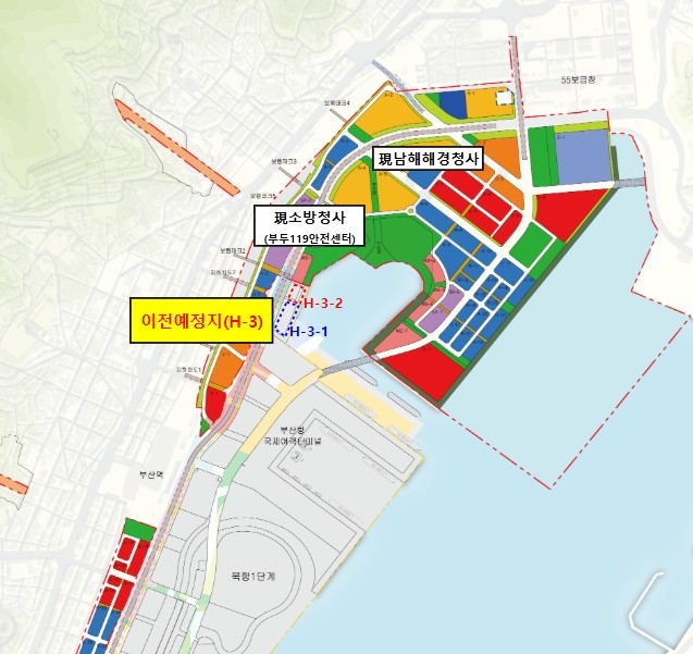 | 부산항 북항 1단계 재개발사업 구역 내 남해지방해양경찰청·동부소방서(가칭) 신청사 위치도. [해양수산부 제공] |