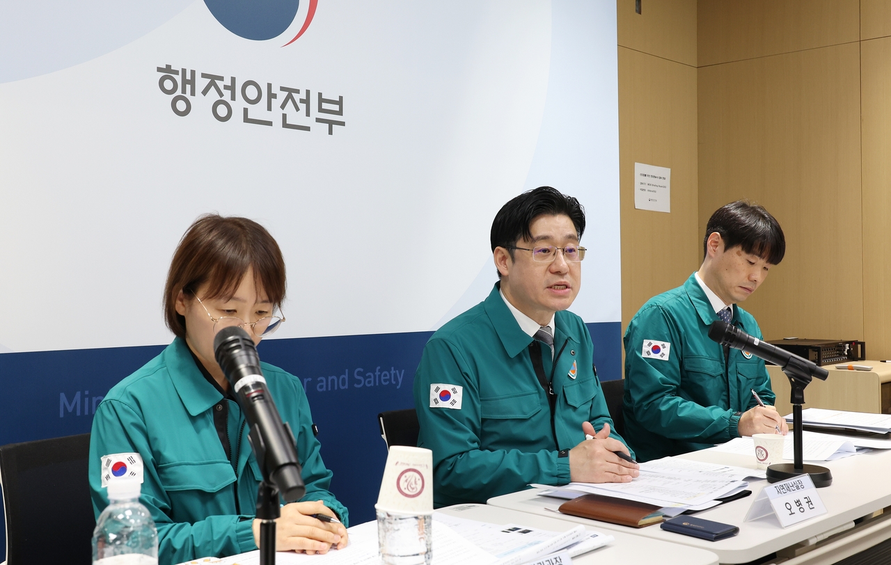 | 오병권 행정안전부 자연재난실장(가운데)이 지난 13일 오전 정부세종청사 중앙동 브리핑실에서 ‘2025년 여름철 자연재난(풍수해·폭염) 종합대책’에 대해 출입기자 대상으로 정책설명회를 하고 있다.[행정안전부 제공] |