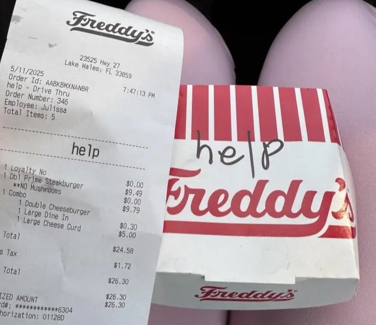 12일(현지시간) 미국 뉴욕포스트 등에 따르면 미국 플로리다주 레이크웨일스에 있는 패스트푸드점에서 한 고객이 소름 끼치는 쪽지를 발견해 온라인상에서 화제가 됐다. 주문한 햄버거 포장 상자와 영수증에는 “도와주세요(help)”라는 문구가 적혀 있었다.