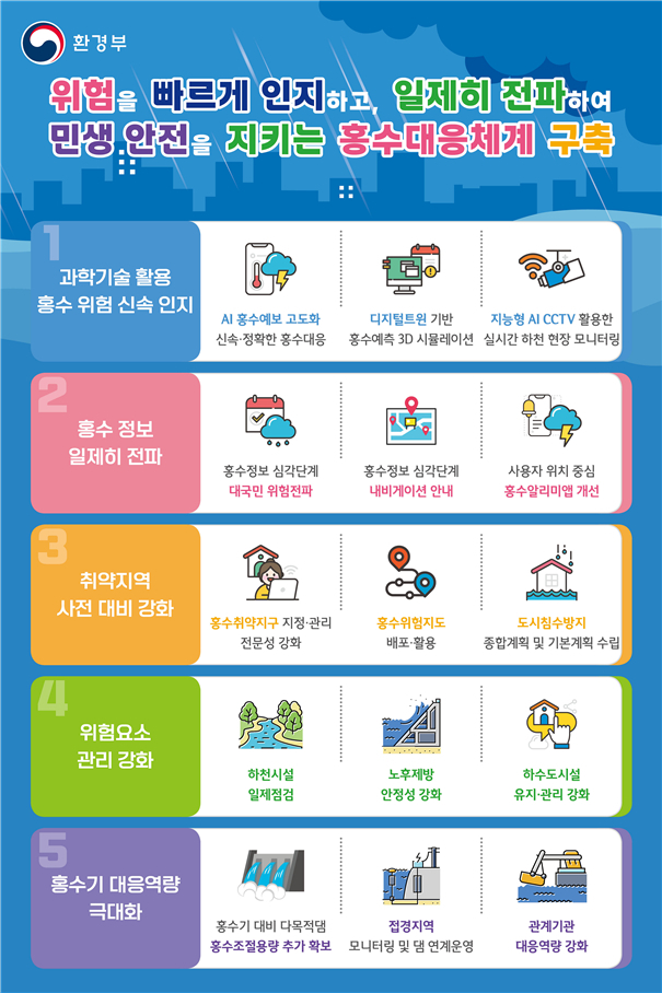 환경부는 홍수에 취약하지만, 시설 개선 등 구조적 개선책을 즉시 적용할 수 없는 곳은 ‘홍수취약지구’로 지정해 전문기관과 점검하고 주민 대피 계획을 마련하는 등 체계적으로 관리하기로 했다.